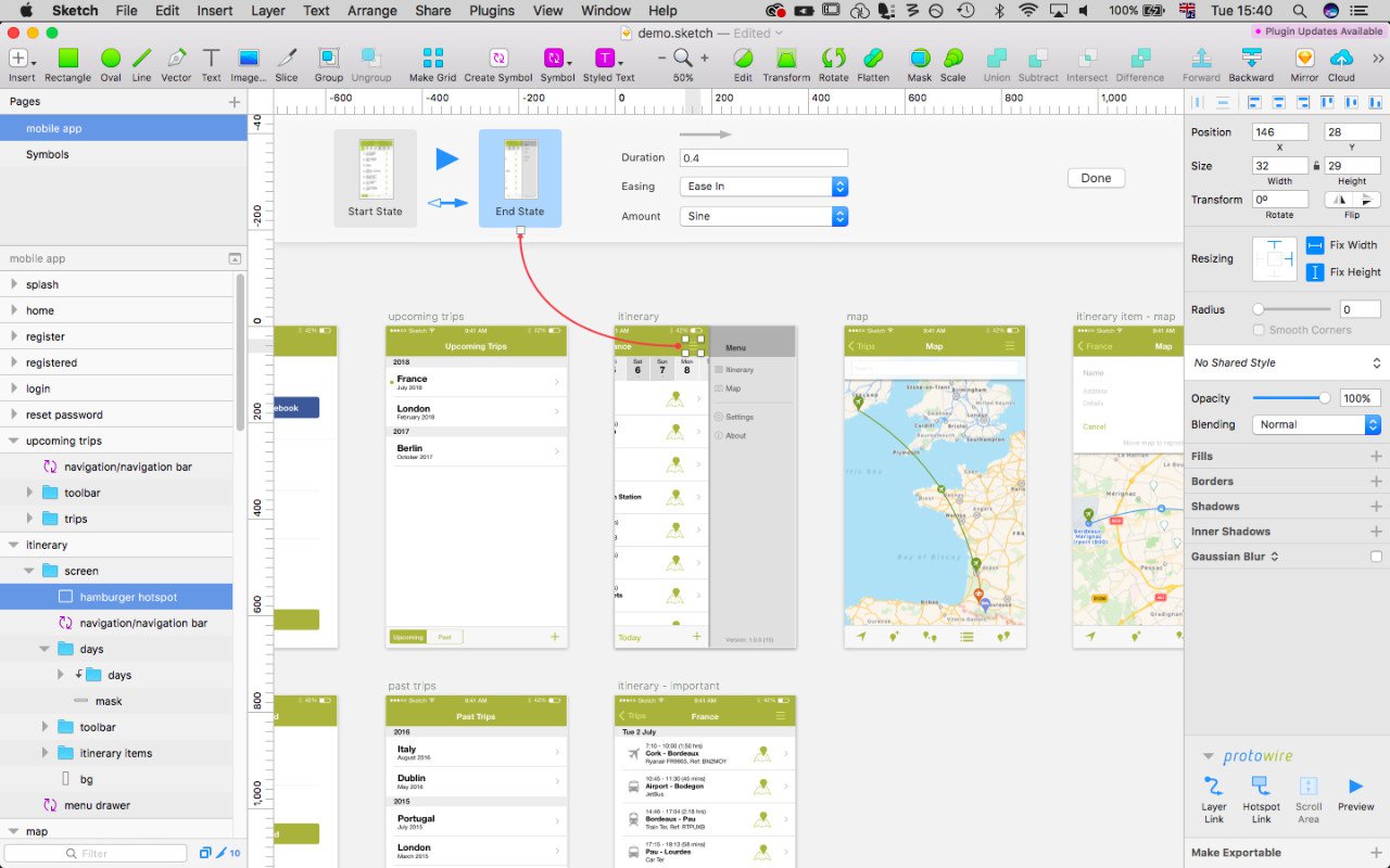 Protowire was a prototyping plugin for Sketch which is a UI design application. At the time Sketch didn't have prototyping. It allowed you to create screen transitions between artboards, overlays, animate layers and scrollable regions. You could also create interactive components like buttons that had a hover effect. The generated prototypes consisted of SVG and a JavaScript layout engine that made use of Sketch's resizing constraints and artboard groups to adapt to any screen size. So you could make a prototype that worked on smartphones and tablets. The prototypes could be shared on the web and had a router so individual screens could be linked to.